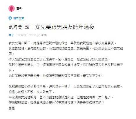 她雖然現在時代不一樣,孩子也都比較早熟,也都有灌輸基本觀念,但仍覺得國二就要和異性過夜,實在不合適,擔心女兒遇人不淑、被人欺負,「想來詢問看看,這個年紀適合讓他和男友過夜嗎?還是是我多想了呢?」